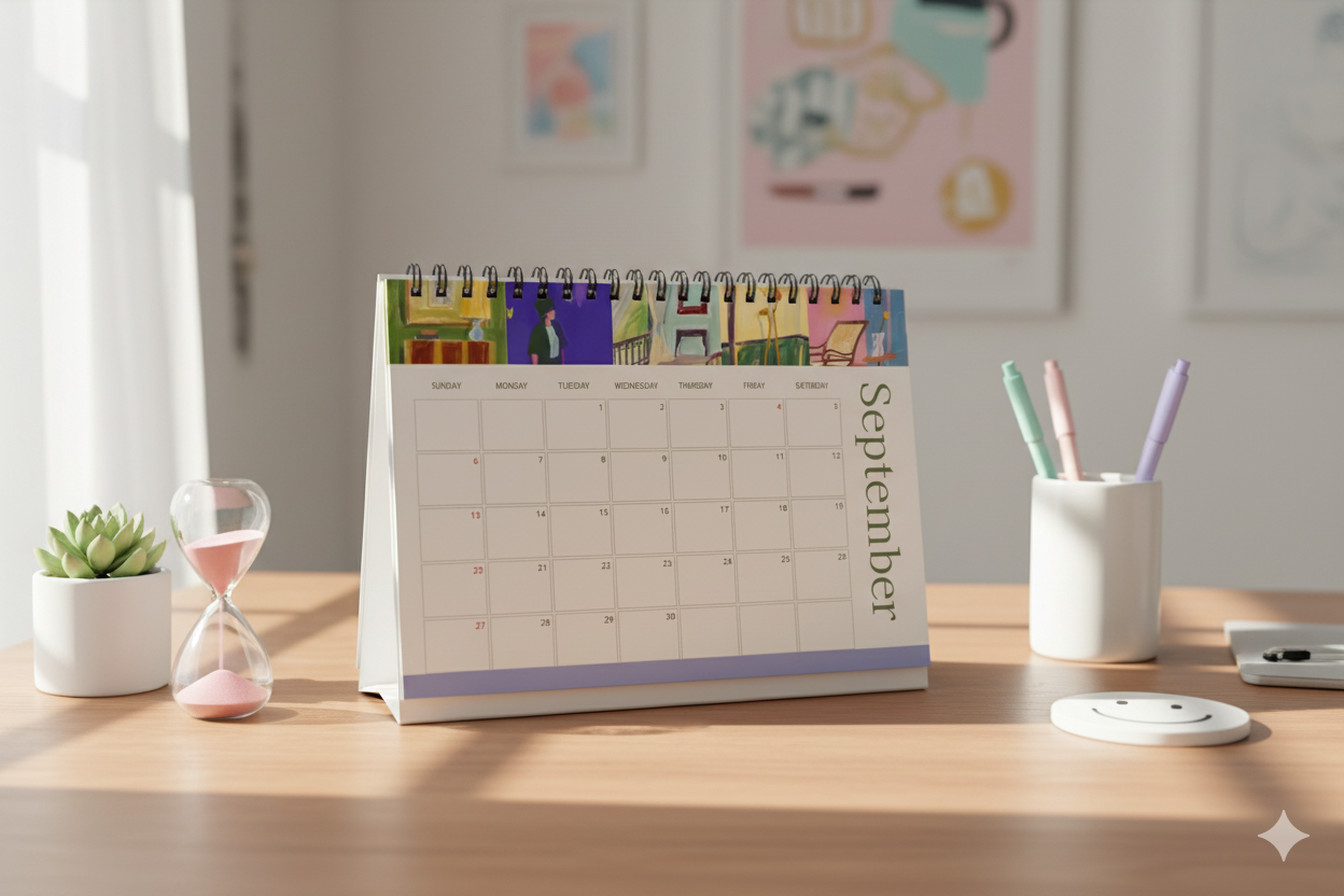Bring artful calm to your workspace with our Abstract Art 2026 Desktop Calendar. Featuring 12 vibrant, hand-painted abstract illustrations in soft pastel tones, this table calendar adds elegance and inspiration to your desk decor. Perfect for home, office, gifting, and creative souls who love aesthetic stationery.
